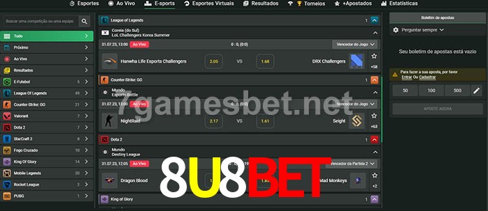 O 8U8Bet oferece uma grande seleção de opções de apostas em e-sports com probabilidades competitivas